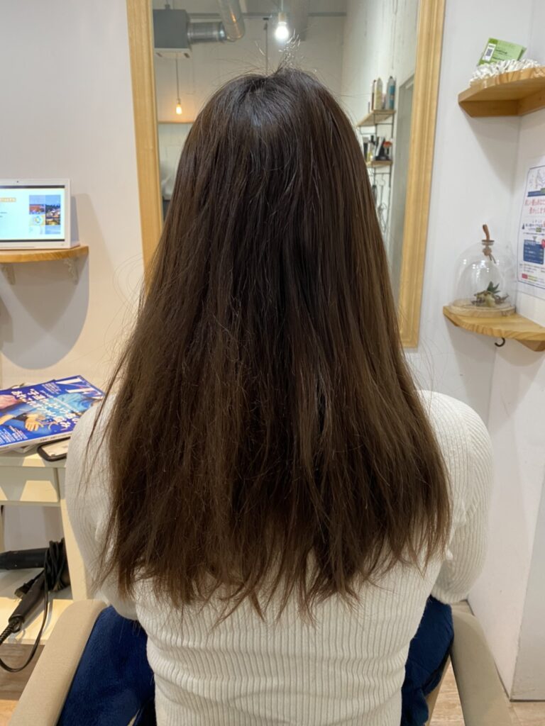 ご来店時はカラーの繰り返しで、綺麗に伸ばしたくても毛先がパサパサで伸ばせない、という状態でした。